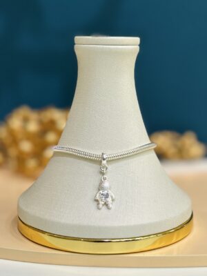 Apresenta um formato delicado de menino, com detalhes cravejados ou pedras de cristal/zircônia para adicionar brilho.