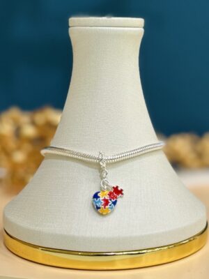 Formato de coração com acabamento esmaltado nas cores azul, vermelho, amarelo e azul claro, imitando peças de um quebra-cabeça.