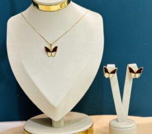 Design: Pingente e brincos em formato de borboleta com detalhes em resina,.